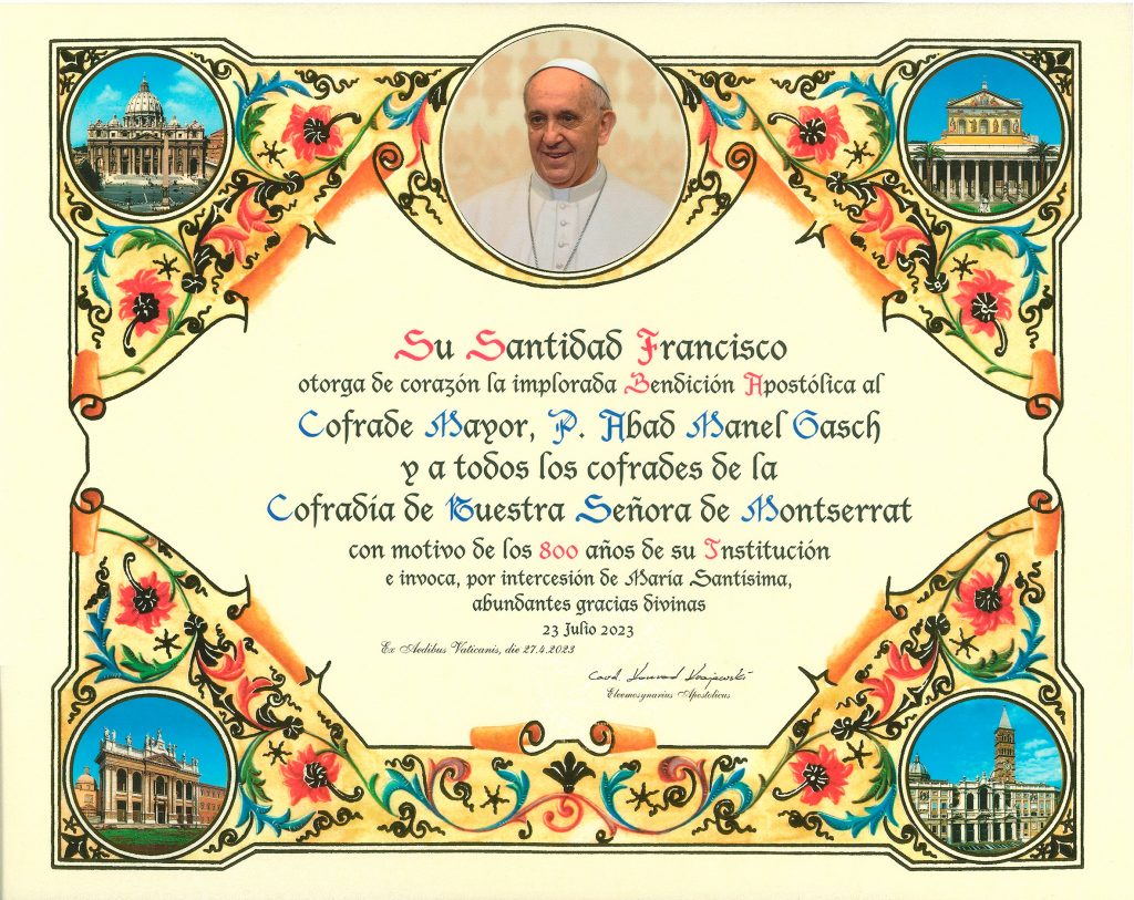 Aquest diumenge 23 de juliol celebrem, dia per dia, els 800 anys de la Institució de la Confraria de la Mare de Déu de Montserrat. A la missa conventual d’aquest dia en farem commemoració. Us convidem a participar-hi a Montserrat o des de casa estant amb la vostra pregària. El Papa Francesc ha volgut unir-se a aquesta commemoració dels 800 anys de la Confraria concedint-nos la seva benedicció. Li agraïm de tot cor i l’encomanem a la pregària de la Mare de Déu.